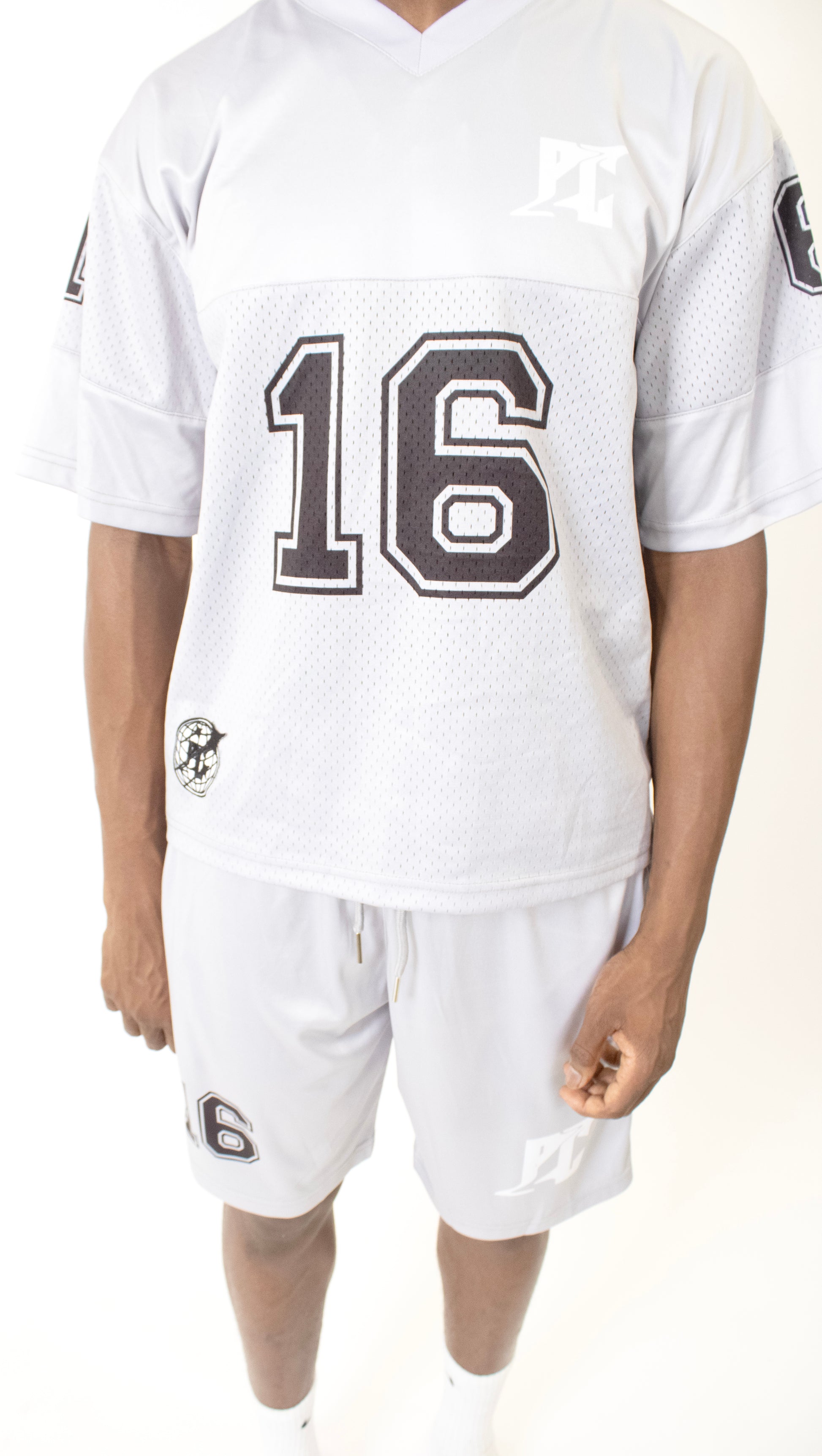 Stay cool and stylish in our lightweight V-neck t-shirt jersey, perfect for all-day wear. Featuring unique details like an embroidered patch on the back, fusion script logo on the chest, and the iconic 'est' year number 16 on the front, this American football-inspired piece adds urban flair to your look. The Plug Calling name is boldly displayed on the back, with the sleeves sporting the numbers 1 and 6 for extra style points. Pair it with the silky matching shorts, complete with breathable mesh panels for added ventilation. Elevate your streetwear game with this must-have set!